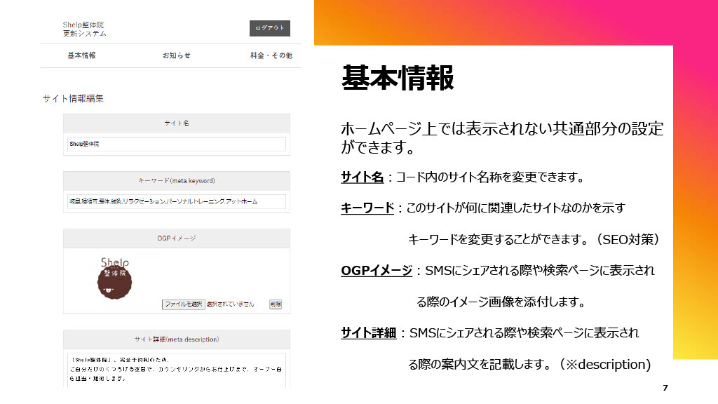 SEO対策としてキーワード設定やdescription入力、SNS共有時のOGP画像設定にも対応しています。