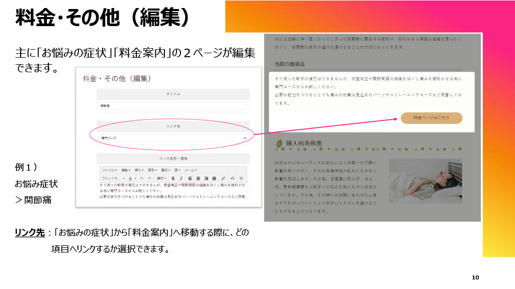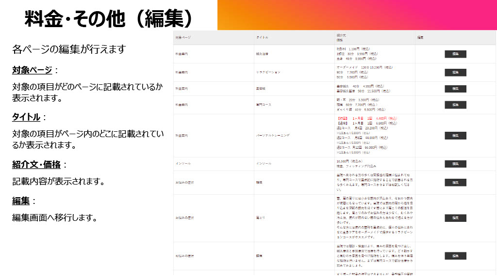 投稿機能に加え、料金ページなどの固定コンテンツも管理画面から編集可能とし、サイト全体の更新性を高めています。