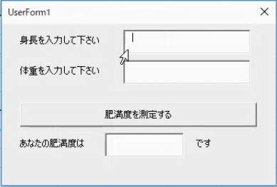 問題.身長と体重を入力すると、肥満度が求めれられる下図のようなフォームを作成する。